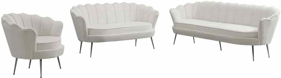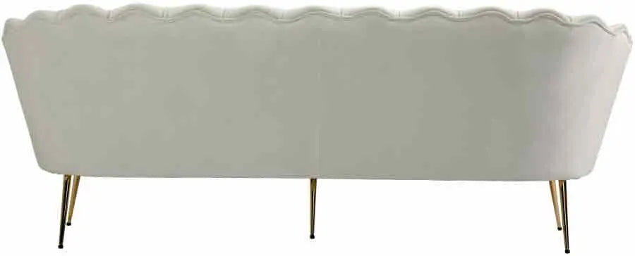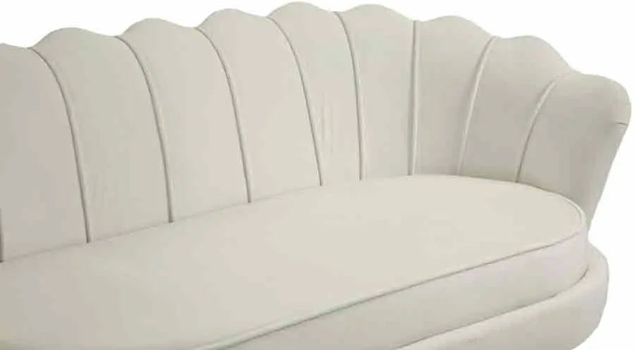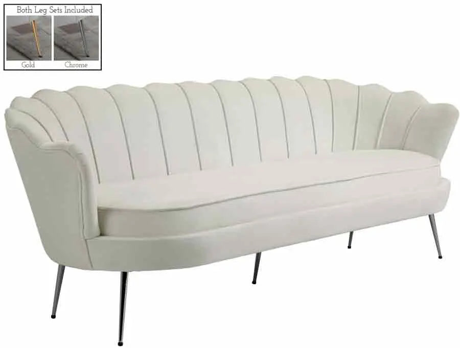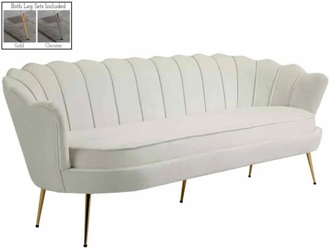 Turn heads in an instant when you add this Gardenia velvet sofa to your room. This attention-demanding sofa features a shell-shaped back with deep channel tufting for added textural appeal. The round seat cushion is deep and generously sized, so you have wiggle room to get comfortable. Soft Cream velvet upholstery covers the entire sofa except for its legs, which are made from chrome for durability and finished in gold for a touch of glam.