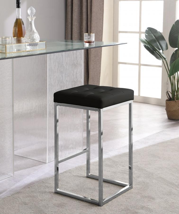 Saunter up to the home bar or kitchen counter and have a seat on this Nicola Black Faux Leather Counter Stool. An elegant armless design adds contemporary panache to your space, and construction with chrome-finished steel gives ample support to the stool while ensuring a modish look. A thick cushion on top is upholstered in soft and durable black faux leather that feels just like the real thing but lasts and lasts with minimal upkeep. The addition of a footrail on the base makes for added sitting comfort.