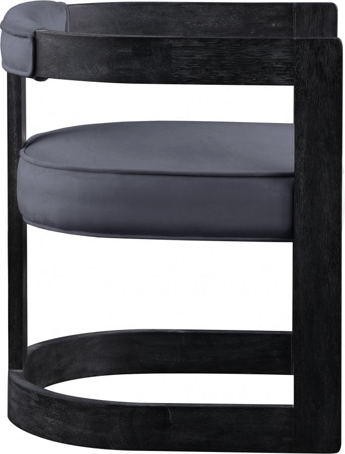 Guests will be overly impressed when you seat them in this Regency velvet dining chair. Solid wood construction lends the chair a durable start while its dark grey finish gives it an upscale, almost affluent look. This contemporary chair is outfitted with soft grey velvet cushioning against its rounded back and seat, ensuring comfort as you dine.