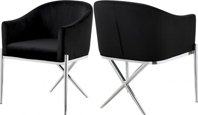 Spread elegance and modernity to your dining room with this Xavier black velvet dining chair from Meridian Furniture. This beautiful chair features a simple barrel seat with a plush cushion and back, ensuring that every meal is a comfortable one. The chrome steel legs provide durable support while you sit, and an "X" leg in the back lends the chair an uber-modern vibe. Chrome finishing on the base is sleek and chic, giving this chair a contemporary edge that's well at home in any modern dining room. Sleek black velvet upholstery is durable and tough yet soft against your body, elevating meal times to a luxurious experience.