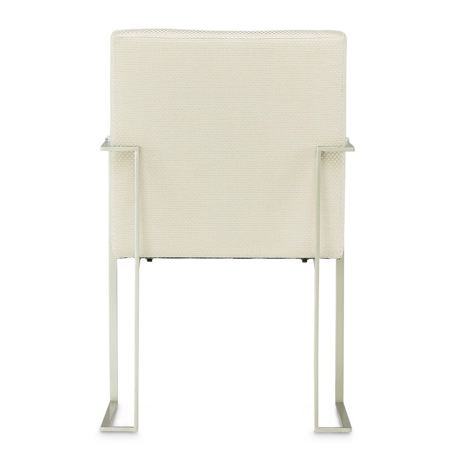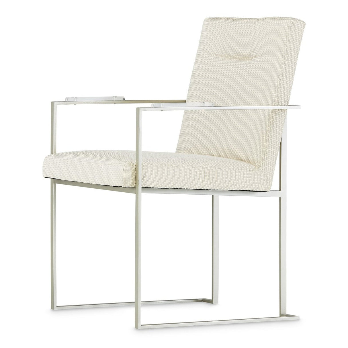 Elevate your dining space with the Laguna Ridge Arm Chair, where thoughtful design meets luxurious comfort. This elegant seating piece showcases textured champagne upholstery, a subtle line-tufted backrest, and armrests accented with sleek acrylic inlays. Its brushed platinum frame adds a shimmering metallic finish that exudes quiet sophistication.