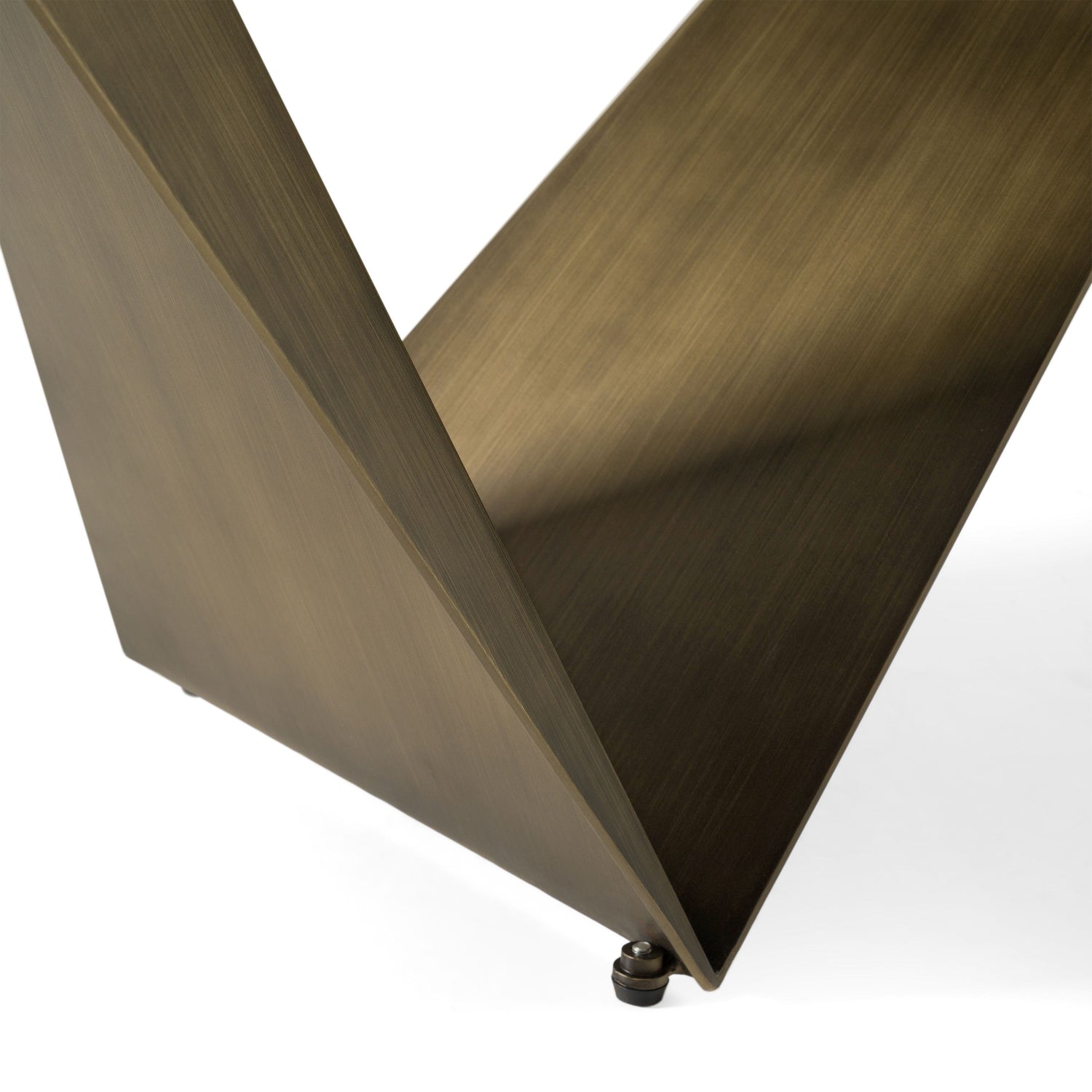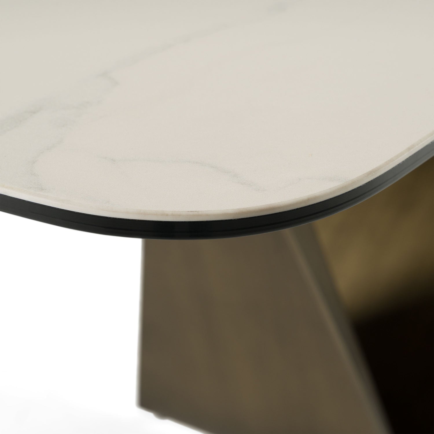 The tabletop is crafted from white ceramic, offering a sleek marble-like aesthetic with contemporary appeal. The base is constructed from brushed brown metal, shaped into geometric triangular forms that provide strength, balance, and a sculptural silhouette.