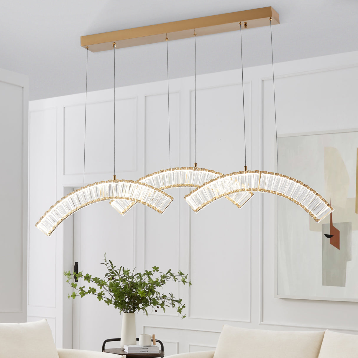 The Sanford Brushed Gold e lights Chandelier, is a stunning LED crystal masterpiece that combines elegance, functionality, and modern design. Features a brushed gold finish that exudes opulence and refinement, high-quality crystals that refract light beautifully, creating a dazzling display of brilliance, and 3 captivating arc shaped lights that enchants any space, guaranteed to be the centerpiece of any room, radiating an aura of luxury and sophistication. Each of the three arcs with an LED strip encased by crystals can be adjustable to the height of your desire (up to 12 feet).