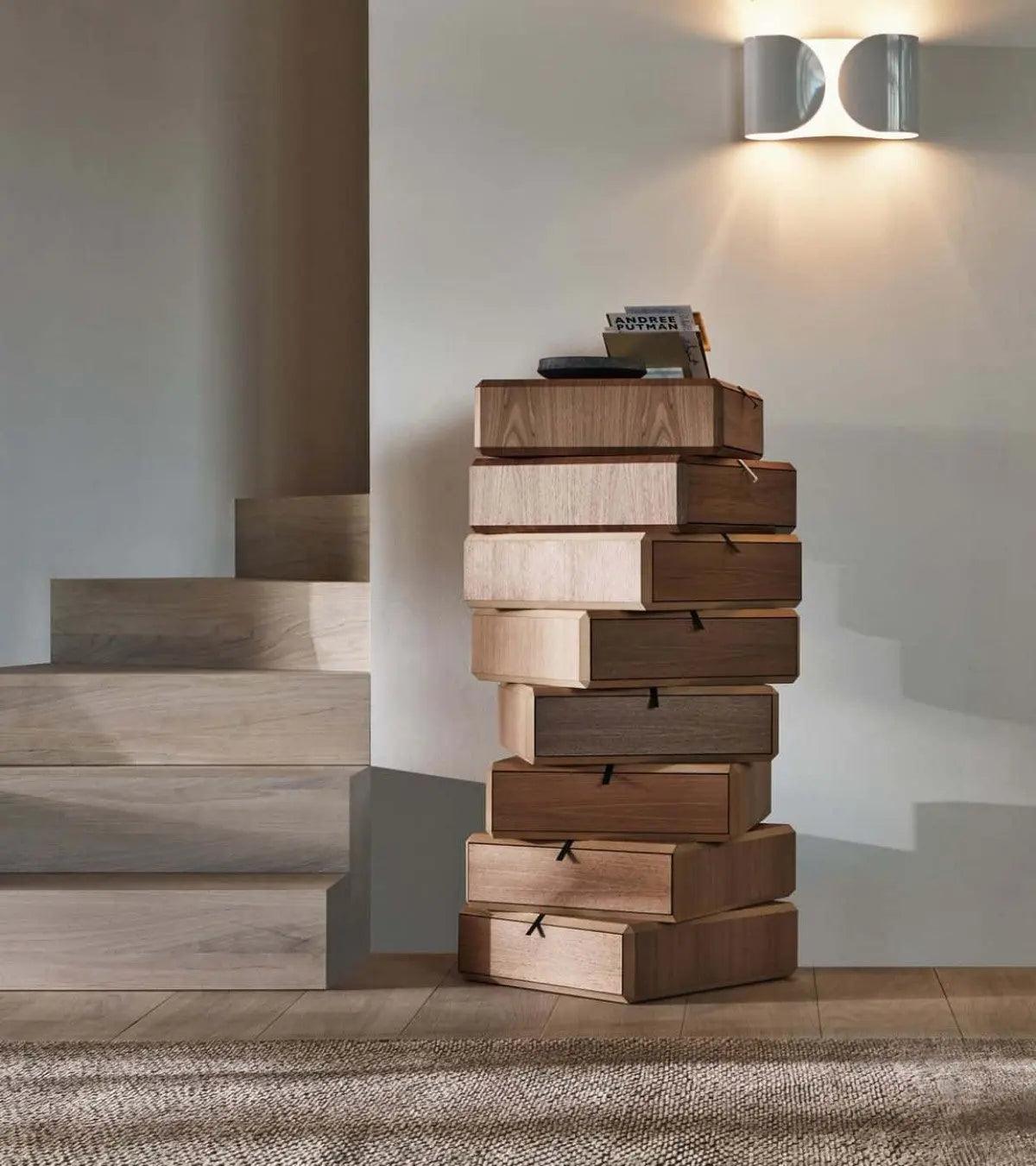 Modern and modular, the maceo drawer box can be stacked to create a multi-drawer nightstand or chest. The Walnut veneer, and black metal drawer pull combine to create a look that is sleek and contemporary, with beveled edge detailing, and can be combined and stacked with other Maceo collection pieces.