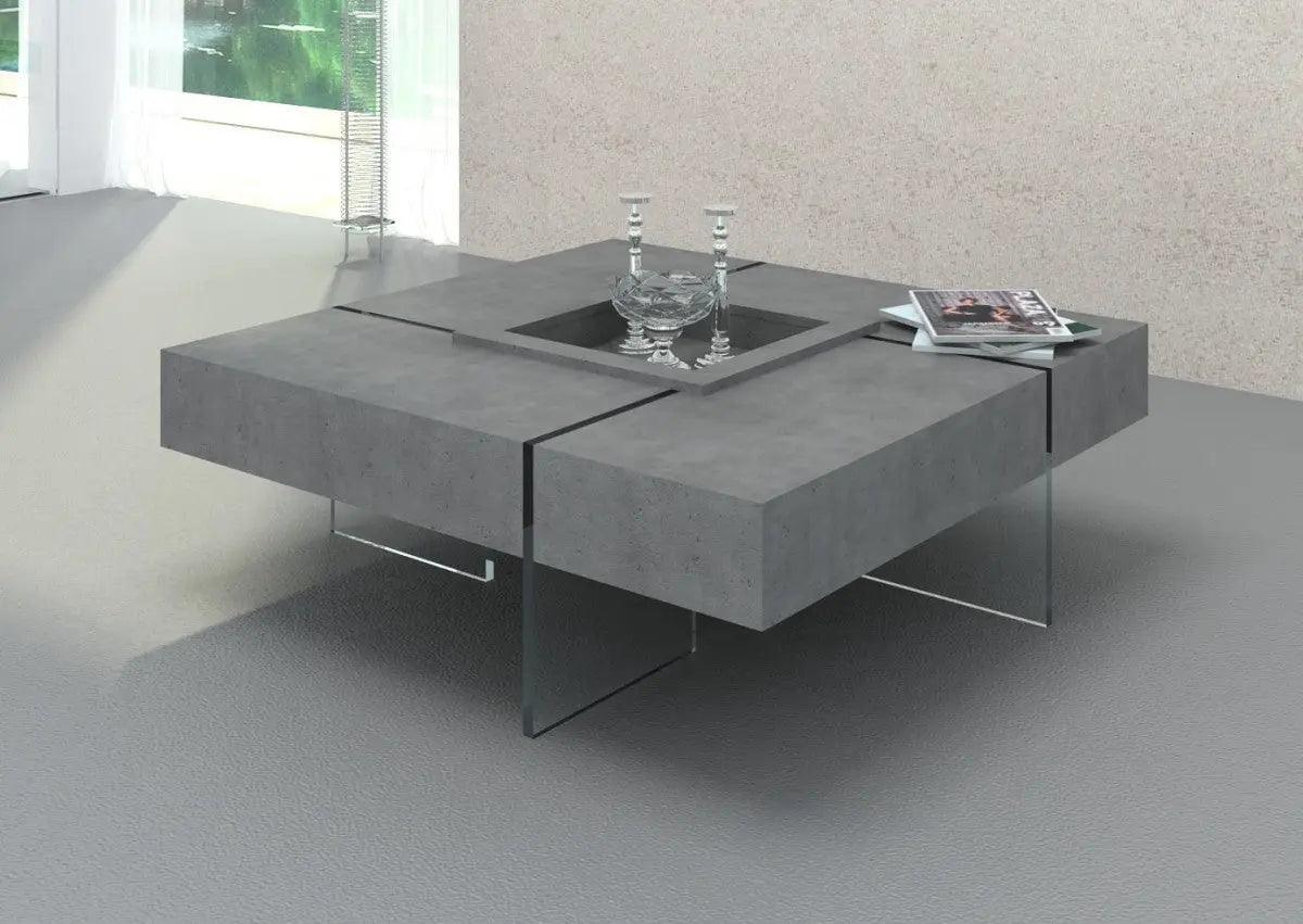 The Shauna square coffee table will look great in your contemprary living room. The concrete laminate is neutral in tone, ready to blen in with any color scheme. The glass legs create a floating illusion and add to the sleek contemporary feel of the piece. in the center of the table there is a sunken compartment perfect for displaying a nice centerpiece or organzing your remotes.