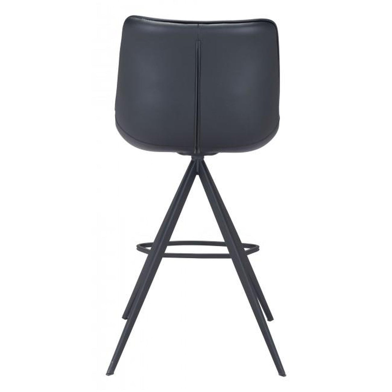 - Its scooped seat in black faux leather rests on slim splayed legs in black with an attached footrest.